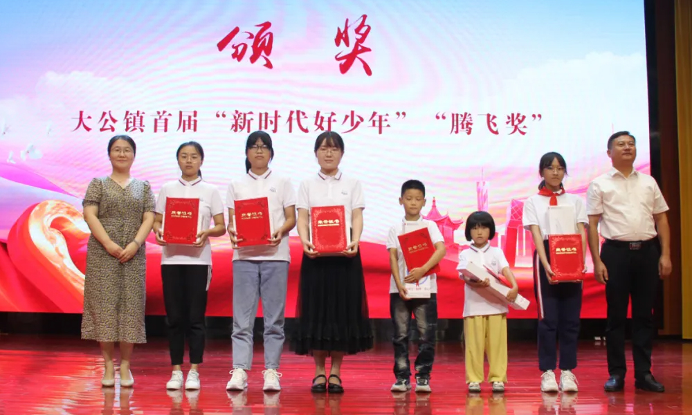 海安市委宣傳部未成年人思想道德建設(shè)科科長奚海寧、大公鎮(zhèn)人大主席王軍共同為大公鎮(zhèn)首屆“新時代好少年”“騰飛獎”獲得者頒獎,并送上禮品。