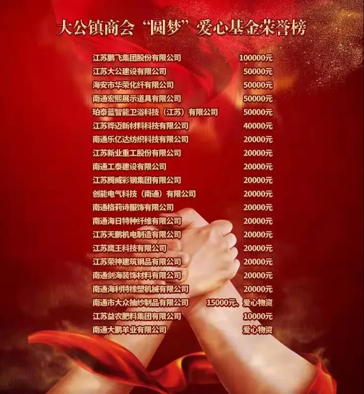海安市政協(xié)副主席、市工商聯(lián)主席蔡祝平,大公商會會長、鵬飛集團(tuán)董事長王家安共同為愛心基金揭牌,宣布大公鎮(zhèn)商會“圓夢”愛心基金正式成立!前期,大公鎮(zhèn)商會21家副會長單位共計籌集60.5萬元愛心善款,所募集資金主要用于:幫助困境青少年、開展青少年公益實踐等活動。