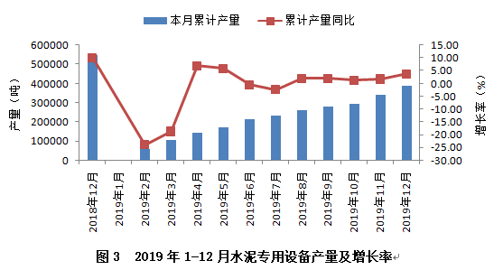 從行業(yè)重點監(jiān)測的產品看,水泥專用設備產量實現(xiàn)小幅增長,2019年累計完成38.65萬噸,同比增長3.69%,較上年同期下降6.37個百分點。從全年產量增速變化趨勢看(見圖3),上半年波動較大,下半年逐步趨緩、趨穩(wěn)。