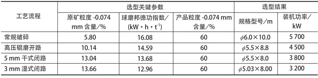 /d、磨礦產(chǎn)品粒度 -0.074 mm 占 60% 情況下,由于不同輥壓工藝下原礦粒度 -0.074 mm 含量和球磨機(jī)邦德功指數(shù)的差異,一段球磨機(jī)選型規(guī)格存在明顯區(qū)別。常規(guī)流程需 1 臺(tái)