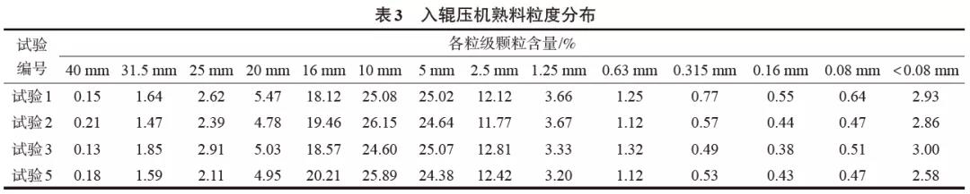 4 試驗(yàn)數(shù)據(jù)的比較和說(shuō)明4.1 試驗(yàn)過(guò)程中輥壓機(jī)物料顆粒組成變化