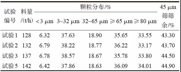 從表3和表4比較可知,四種試驗(yàn)運(yùn)行情況下,試驗(yàn)原始物料配比不變,熟料粒度差別不大的情況下,隨著投料量的增加,出V型選粉機(jī)微粉總體變粗。