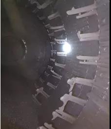 原出料篦板為篩板外加鑄件邊框的防堵型篦板,篦縫為 5~ 8 mm,此種篦板雖有防堵效果,但磨尾的粗顆粒物料與鋼段會(huì)從篦板之間的縫隙中進(jìn)入到選粉機(jī),再進(jìn)入磨機(jī)一倉(cāng)。