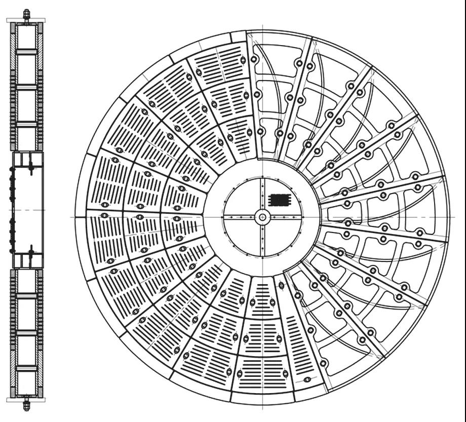 結(jié)構(gòu)方面,在考慮研磨體填充率與料面的情況下,盡可能增大中心圓的直徑,隔倉(cāng)兩側(cè)采用篦板,篦縫寬度為 6 mm,通孔率為 7.8%,兩側(cè)篦板的通孔率保持一致,可改善隔倉(cāng)截面通風(fēng),降低通風(fēng)阻力和中心圓處風(fēng)速。物料流動(dòng)方向安裝有閘板,現(xiàn)場(chǎng)可根據(jù)粉磨工藝及物料特性等來(lái)控制物料的流速,從而提高產(chǎn)品的質(zhì)量和產(chǎn)量。