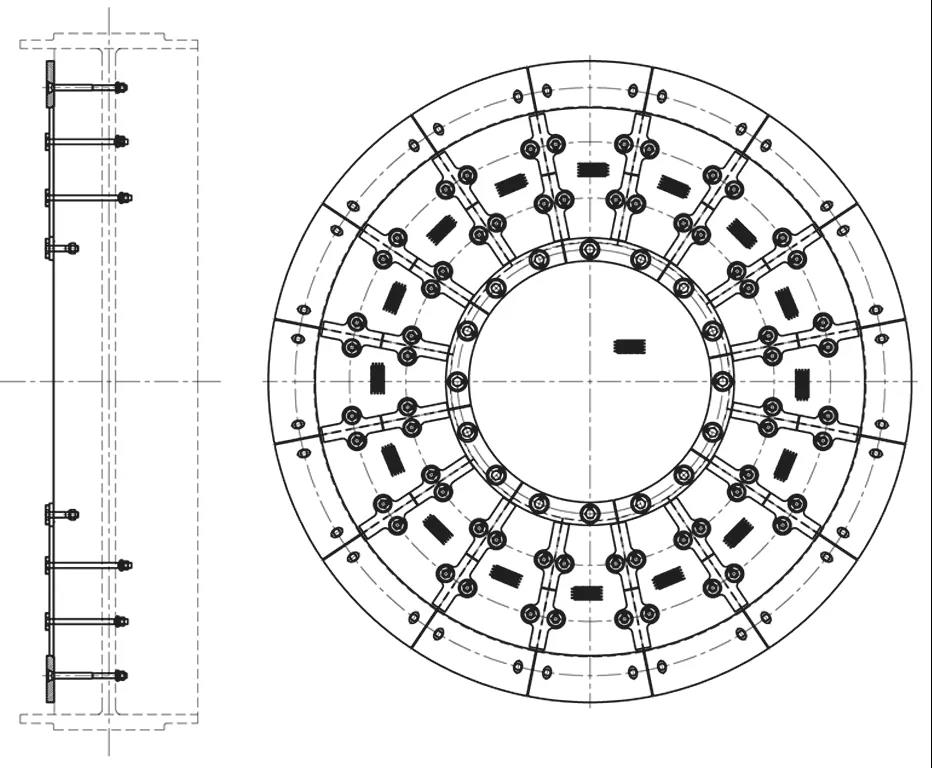 由于物料在進(jìn)入磨機(jī)前經(jīng)過(guò)了輥壓機(jī)和 V 型選粉機(jī),粒度較細(xì),研磨體直徑較小,因此,筒體襯板均采用超薄襯板,既降低了襯板質(zhì)量,又增加了筒體有效內(nèi)徑,在填充率一定的情況下,料面降低,可以增大隔倉(cāng)裝置的中心環(huán),進(jìn)而改善磨內(nèi)通風(fēng)。