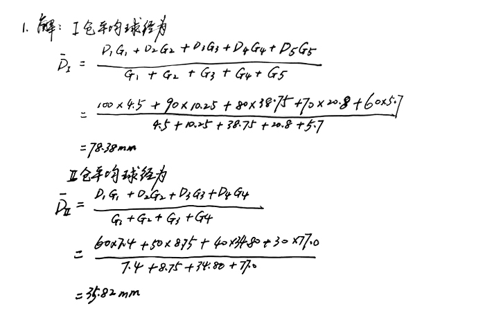 1、φ4.2*12m磨機(jī)鋼球級(jí)配方案是Ⅰ倉(cāng):φ100mm的4.5t,φ90mm的10.25t,直徑80mm的38.75t,φ70mm的20.80t,φ60mm的5.70t;Ⅱ倉(cāng):φ60mm的7.40t,φ50mm的8.75t,φ40mm的34.80t,φ30mm的77.0t,求Ⅰ、Ⅱ倉(cāng)的平均球徑。